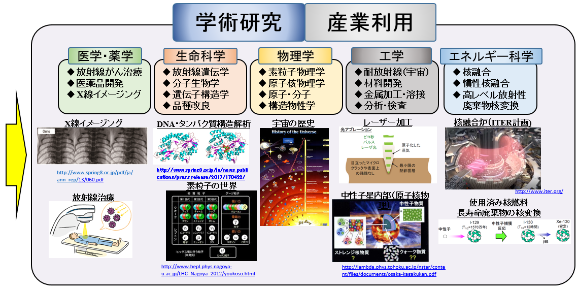ニュートリノ、X線、ガンマ線、レーザーなど)は、物理学、医学、薬学、工学の学術的研究に加えて、エネルギー科学、産業